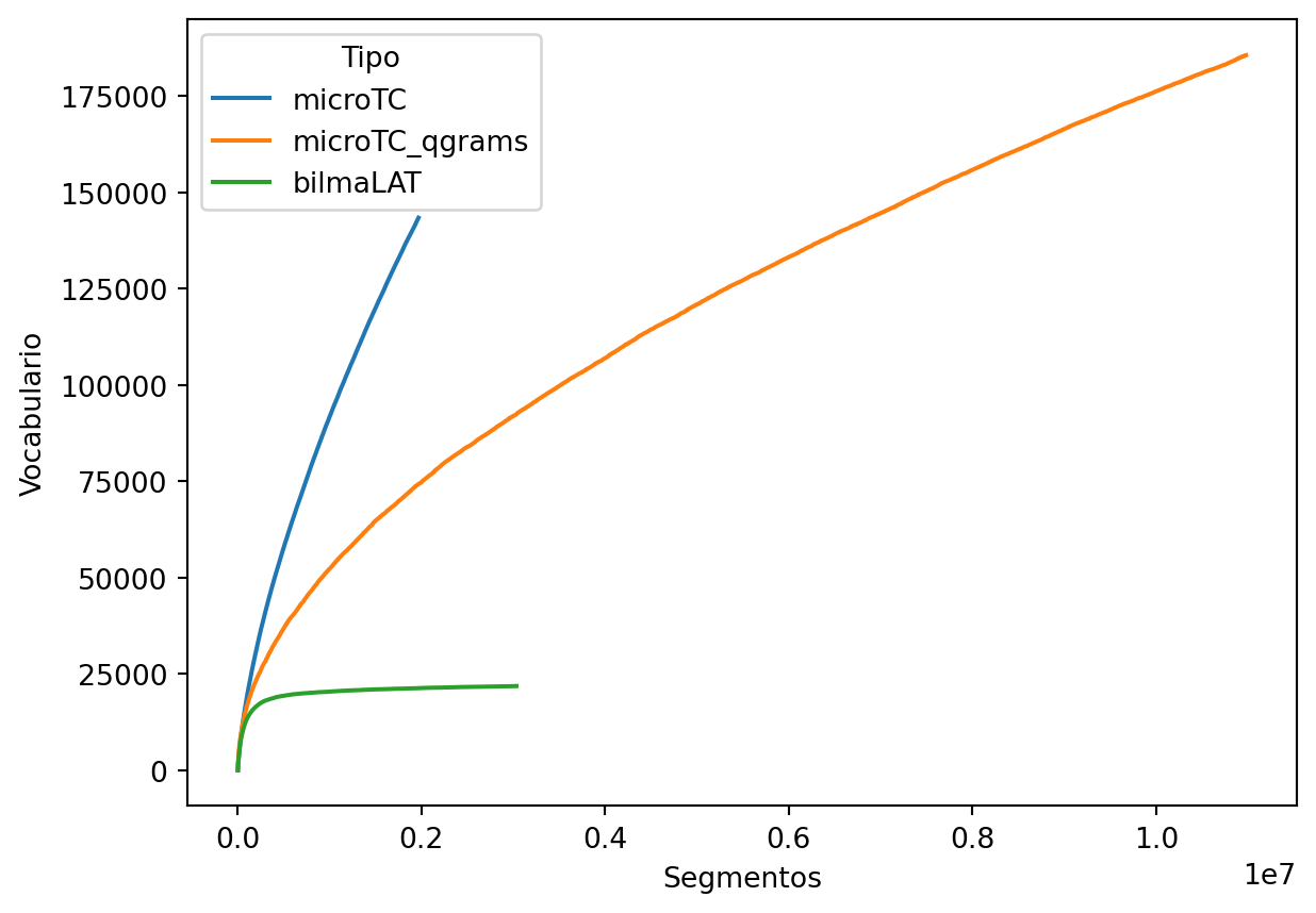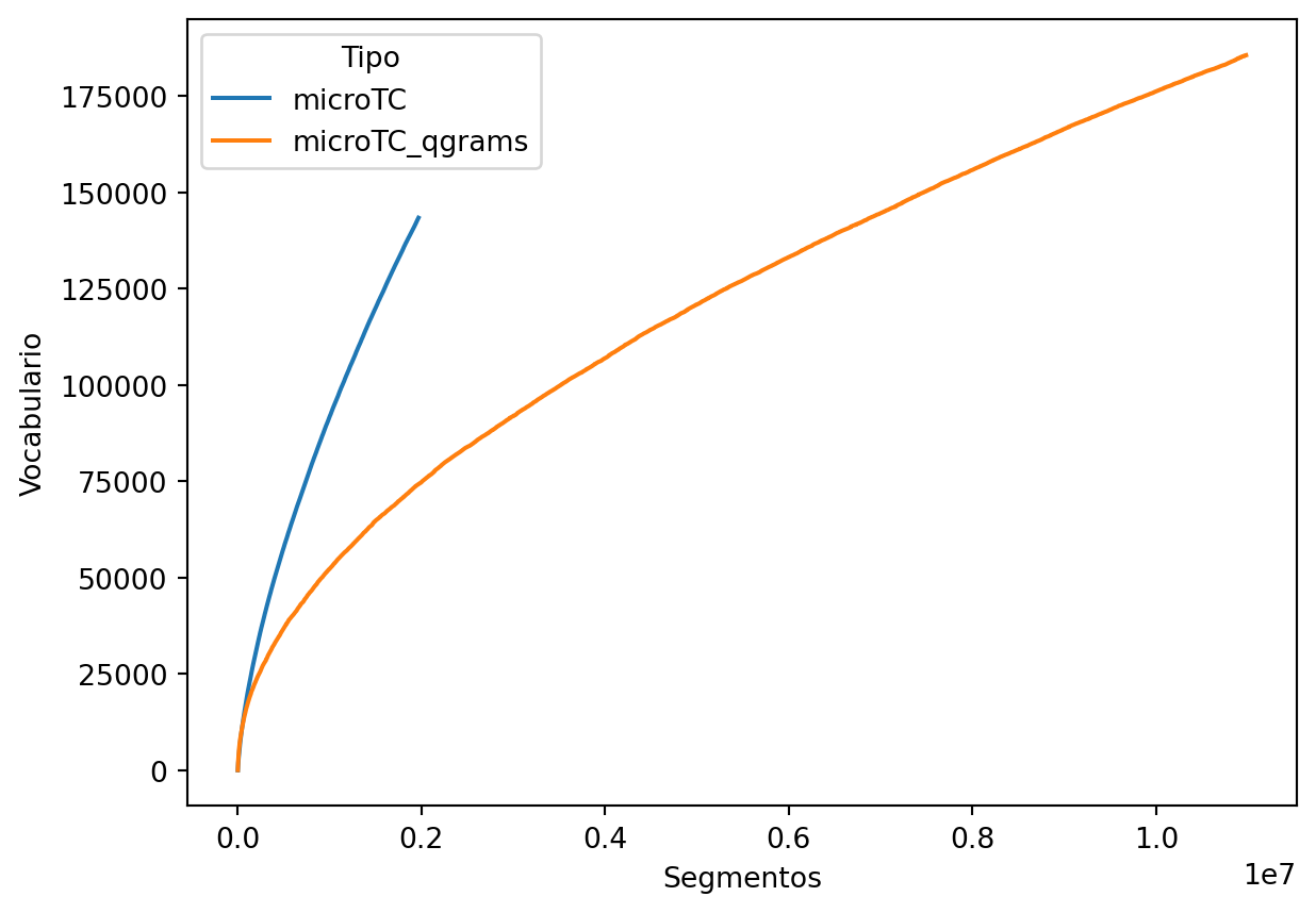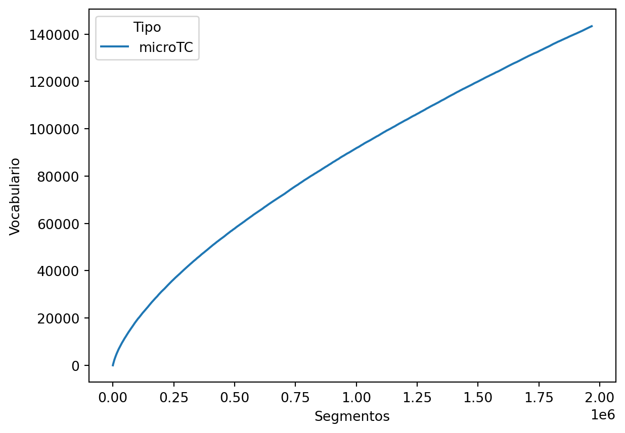 df['Tipo'] = 'microTC'La dinámica del crecimiento de vocabulario con respecto a la cantidad de palabras procesadas se puede observar en la salida de la celda siguiente.